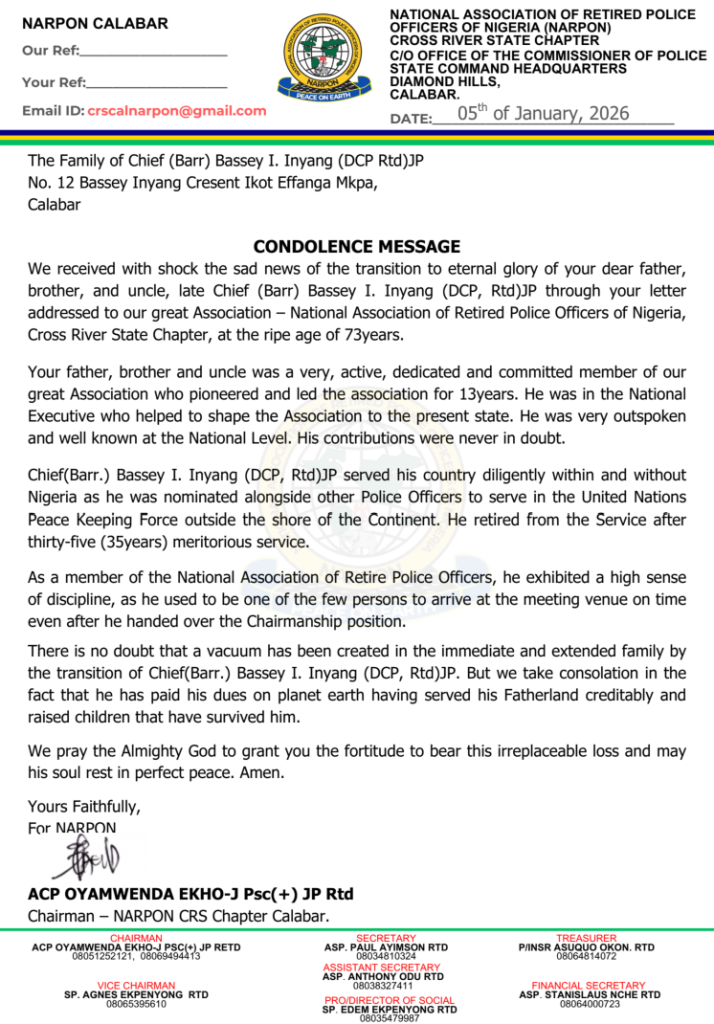 Condolence Message – From The National Association of Retired Police Officers of Nigeria (NARPON) Cross River State Chapter