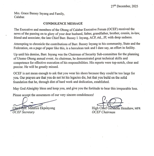 The demise of your husband, Chief Barr. Bassey Inyang Inyang (DCP)Rtd. came as a big blow to us, the wives of Isaac Family; a family Daddy sacrificed so much for. He introduced the idea of the wives joining their husbands in attending Isaac Family meetings, which made other families admire us so much, an idea that has been embraced by other families. No wonder he was nicknamed “Daddy wey dey pamper”.